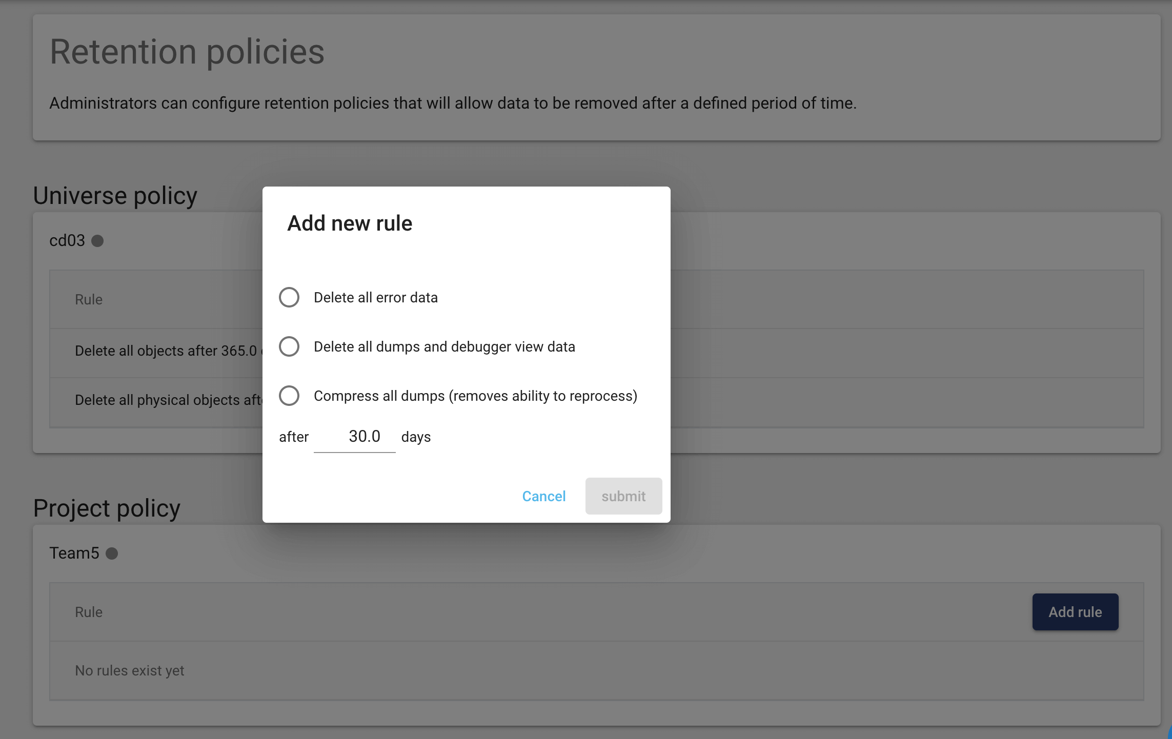 When a retention policy compresses dumps, you will still be able to view, query, and aggregate on the metadata. You will still be able to view the dump in the debugger view and download the original object / any attachments. The ability to reprocess those dumps (to apply symbols or index attributes) is removed.
