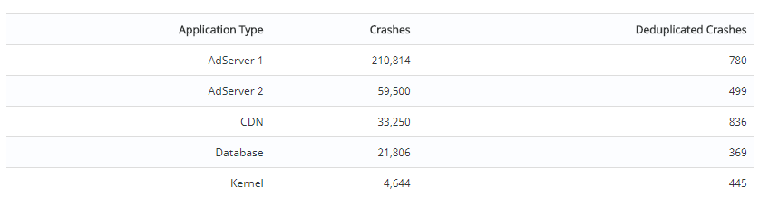 The deduplication mechanism itself greatly reduces the surface area of bugs that engineers have to comb through for purposes of triage. Below are some examples from production workloads ranging from operating system kernels to real-time servers. The crashes column represents the raw number of crashes and the "Deduplicated Crashes" column represents the number of deduplicated crashes with Backtrace.