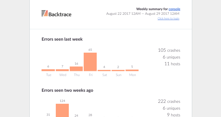 The report includes trends for the current reporting period, the previous reporting period, histograms of attribute values, classifiers as well as an activity of recent unique crashes.
