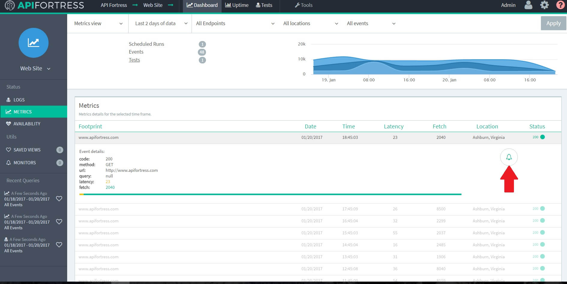 Enter the name of the alert, select the type of monitor (latency or fetch), and the max value for the trigger. Latency is the time it takes to ping the endpoint and receive a response. Fetch is the time it takes to download the response itself. Large responses will lead to large fetch times, so be aware of this when setting a number. Values are in milliseconds.