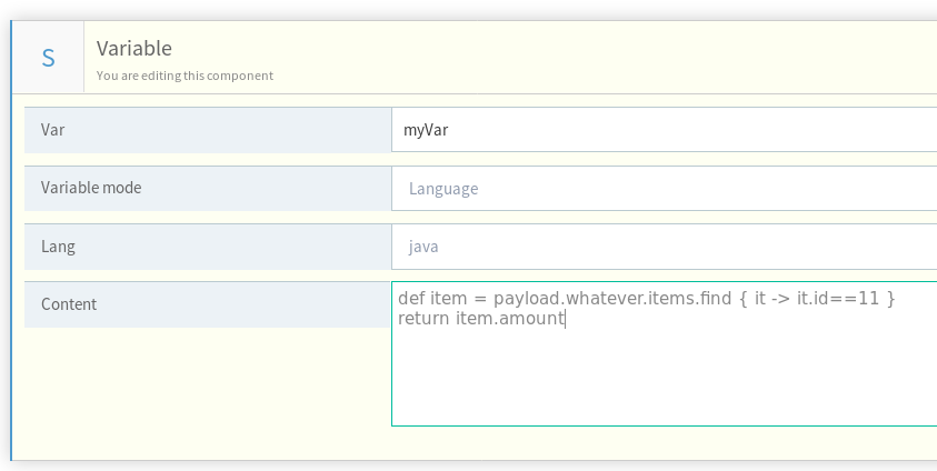 <set var="myVar" lang="java"> <![CDATA[ def item = payload.whatever.items.find { it -> it.id==11 } return item.amount ]]> </set>