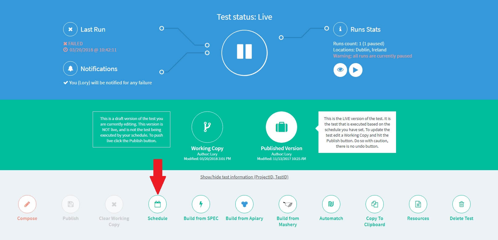 API Fortress has a unique working copy/published copy system. This system allows you to edit a test without affecting the live, currently active version. You can learn more about it here.