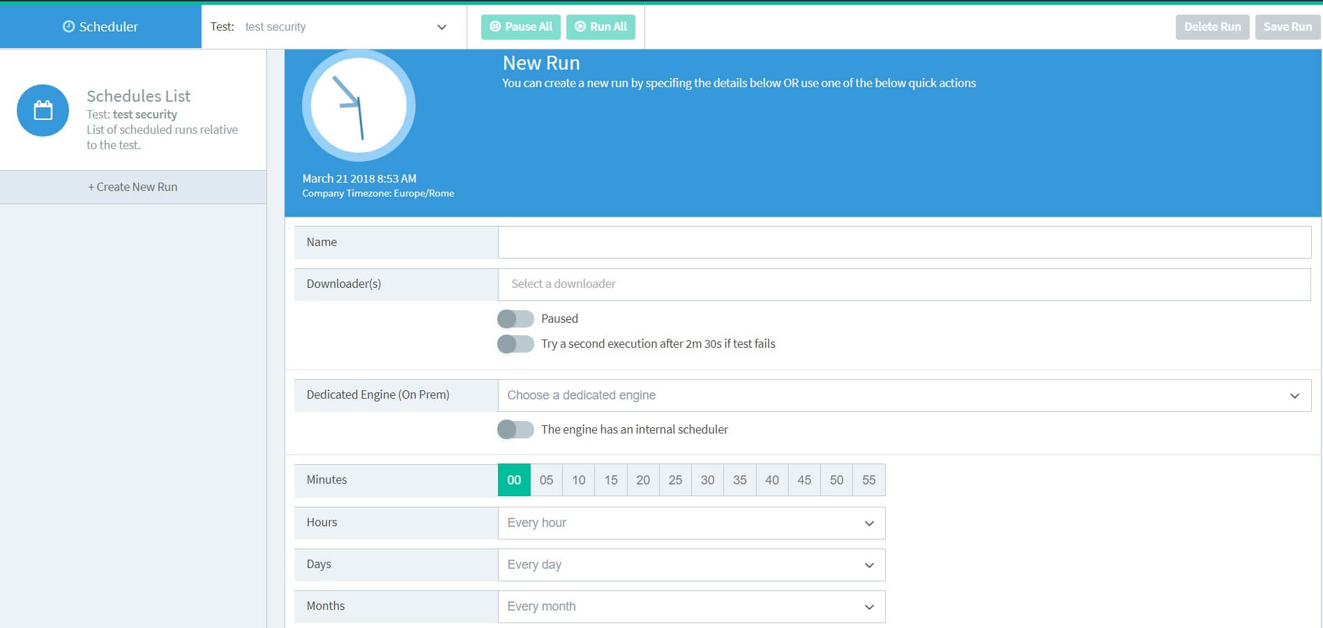 Click + Create New Run on the left side of the screen to create a new scheduled run of your test.