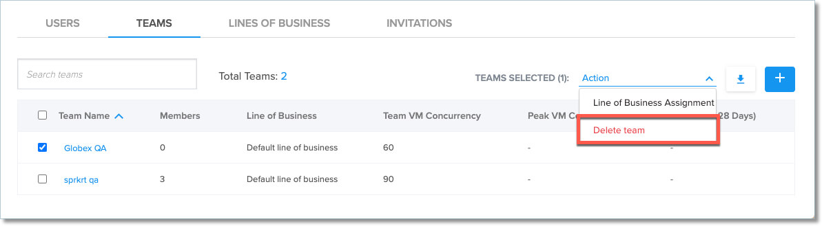 - Next to TEAMS SELECTED, in the Action dropdown, click Delete team.