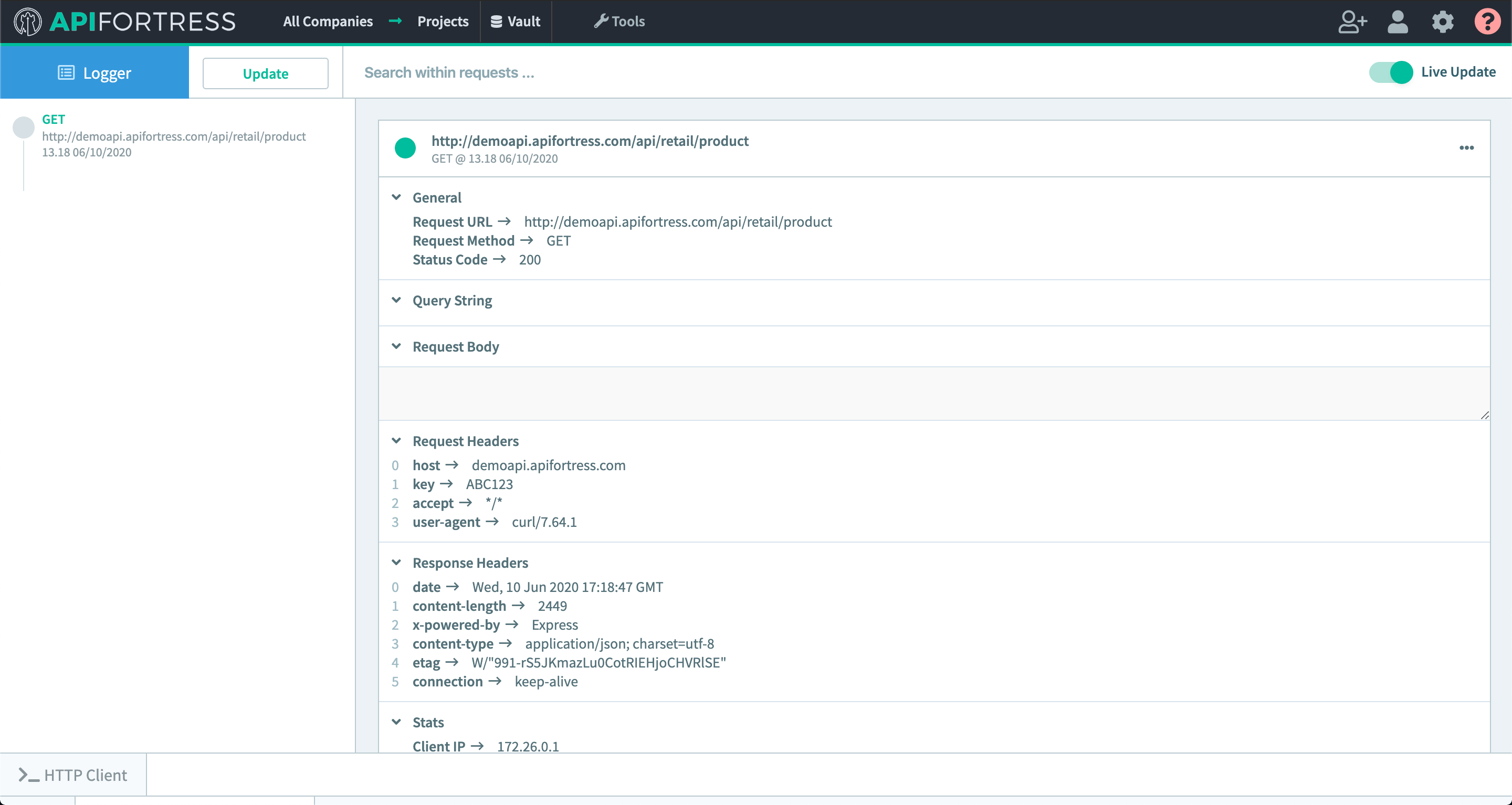 5. Click "Update" on your API Fortress Logger again and notice the forwarded API conversation