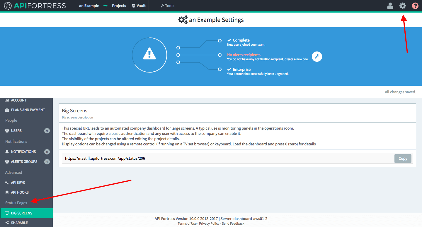 Generating a status page is as simple as clicking the Gear icon in the top right corner of the page, and going to the Status Pages section.