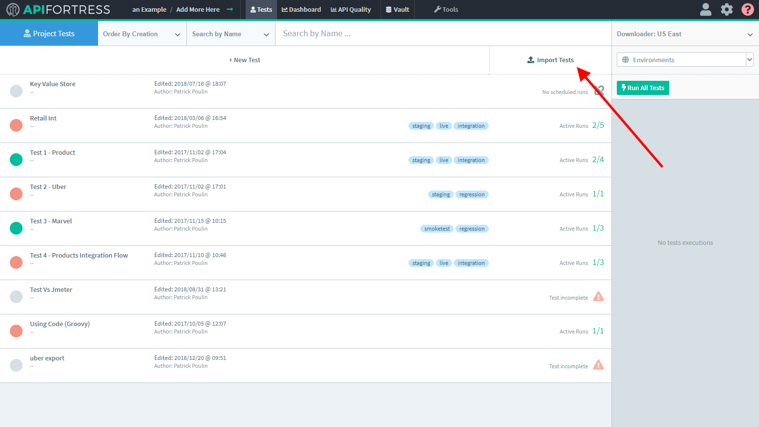 API Fortress makes it very simple to import and export your tests. This is useful when moving tests to another project, making another API Fortress deployment, or sharing with our support team for help.