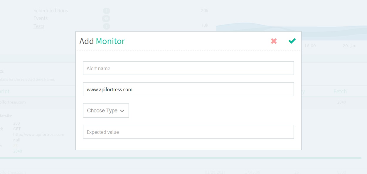 Enter the name of the alert, select the type of monitor (latency or fetch), and the max value for the trigger. Latency is the time it takes to ping the endpoint and receive a response. Fetch is the time it takes to download the response itself. Large responses will lead to large fetch times, so be aware of this when setting a number. Values are in milliseconds.