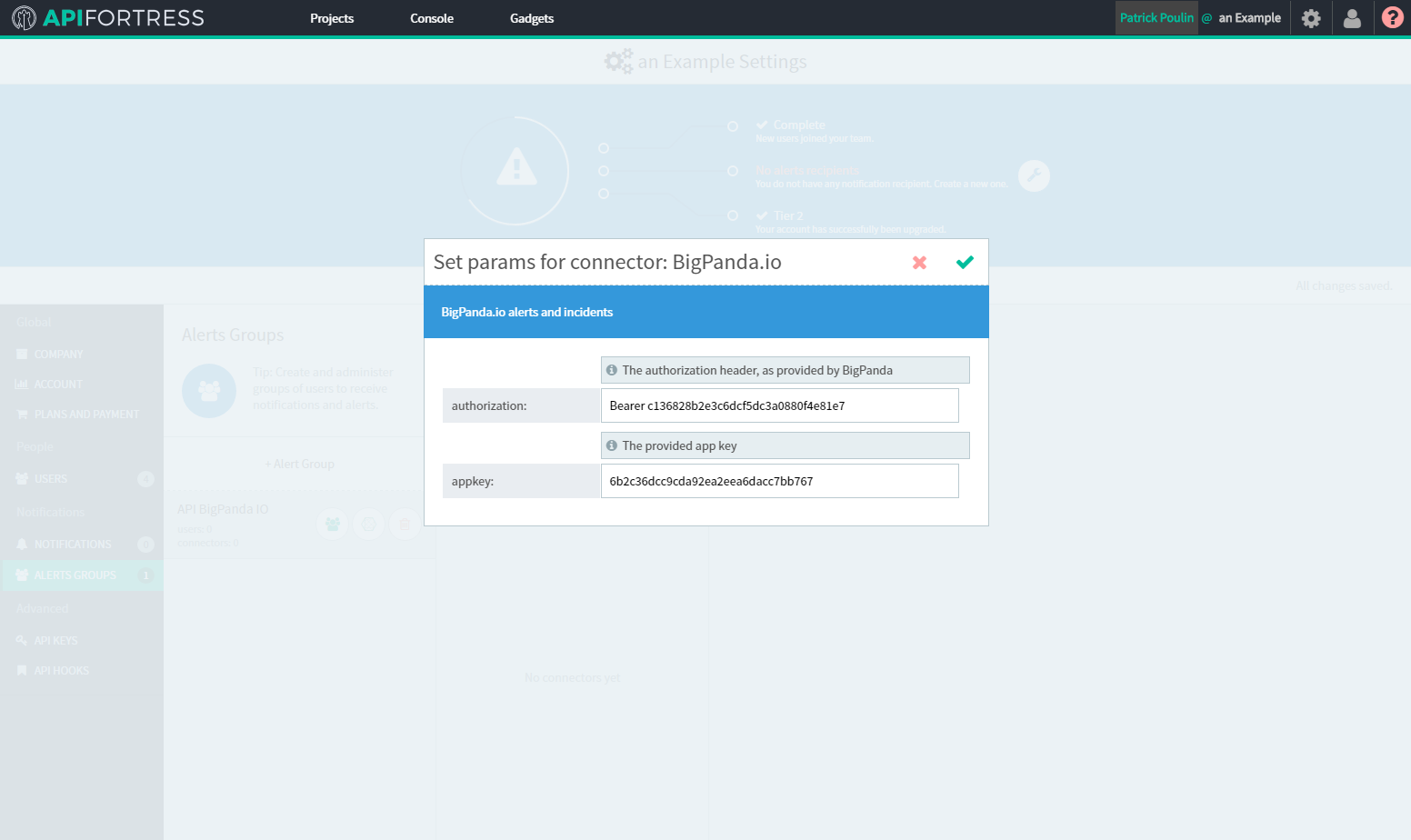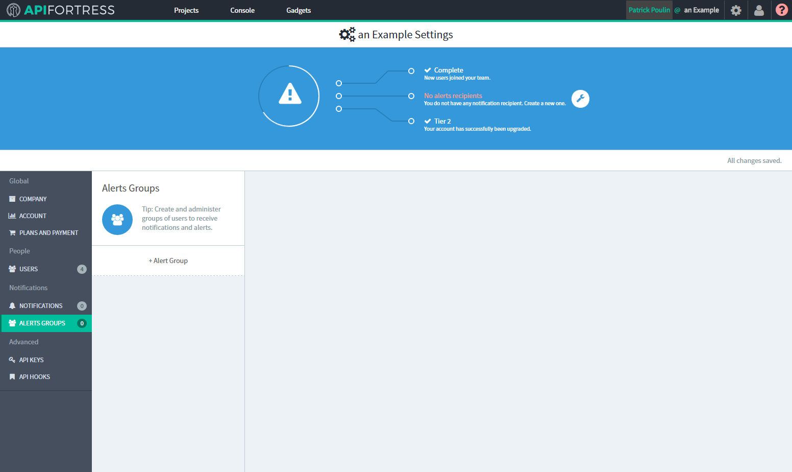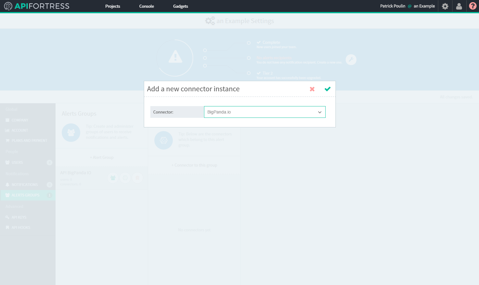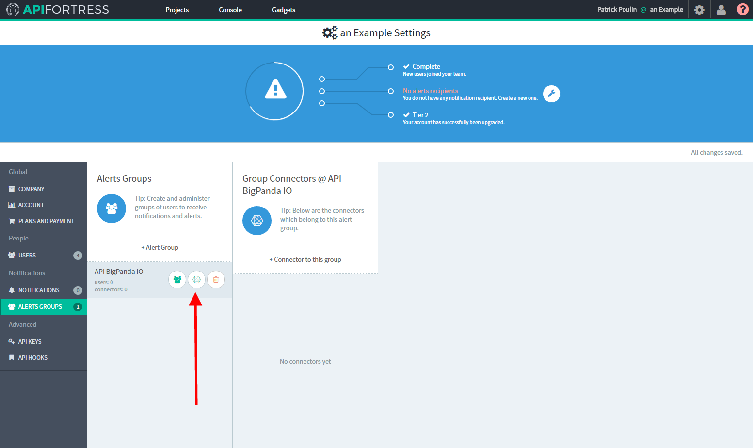 Login to API Fortress and click the gear icon. Then click on Alert Groups. This is where all the connectors are located.