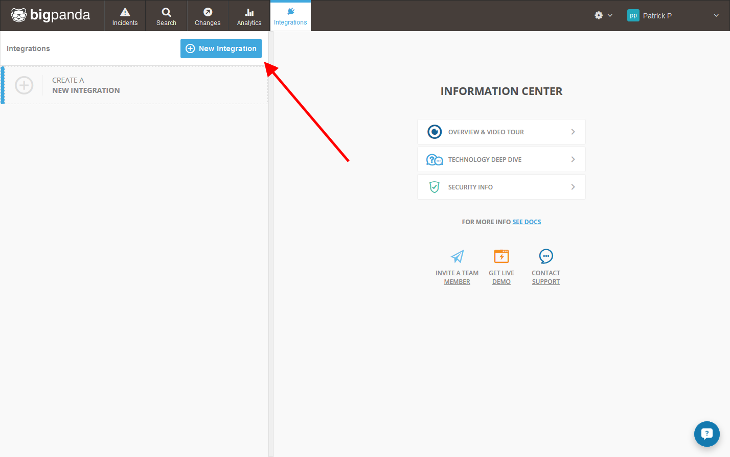 Login to your BigPanda account, and click on the Integrations tab, and then on New Integration.