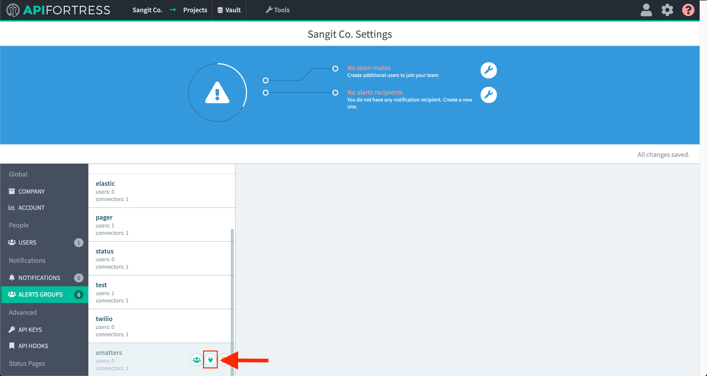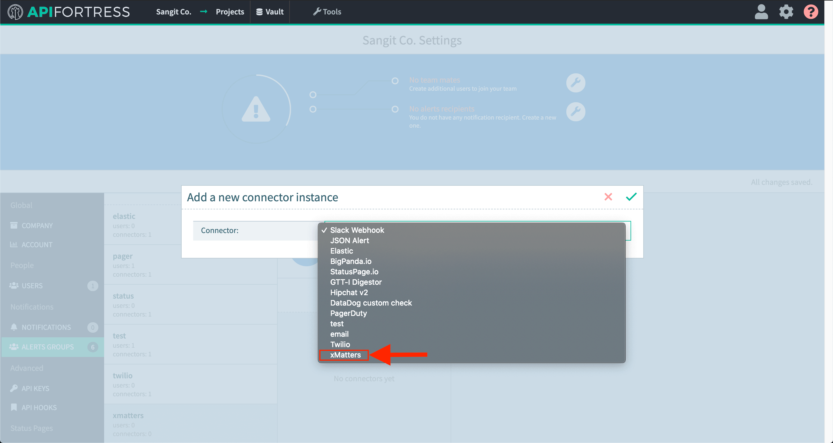 8. Add the alert group that contains your xMatters connector to this project