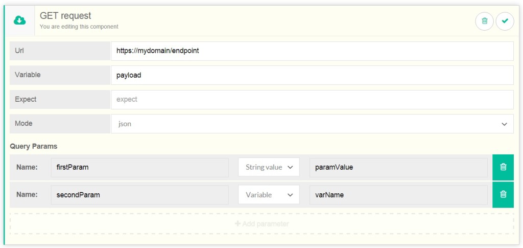 Params: the optional list of params you want to add to the query string. To do so, tap on 'Add parameter'. The params can either be a String value (in that case, the value will always be the same for all the requests; to do so, just put the value in the related field and choose 'String value' from the drop down menu) or a Variable (in that case the value will be taken dynamically and could changed from time to time; to do so, put the name of the variable inside the field and choose 'Variable' from the drop down menu).