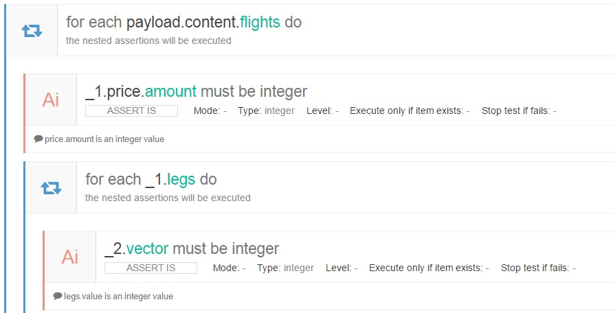 for each payload.content.flights collection checks if 'price.amount' is an integer and then, for each legs array (that is a nested collection in the flights collection) checks if vector item is an integer value.