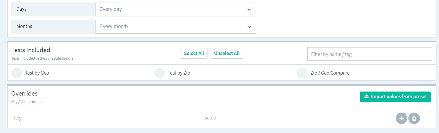 Time configuration – This allows you to select when your tests will run. The time configuration system works via intersection.