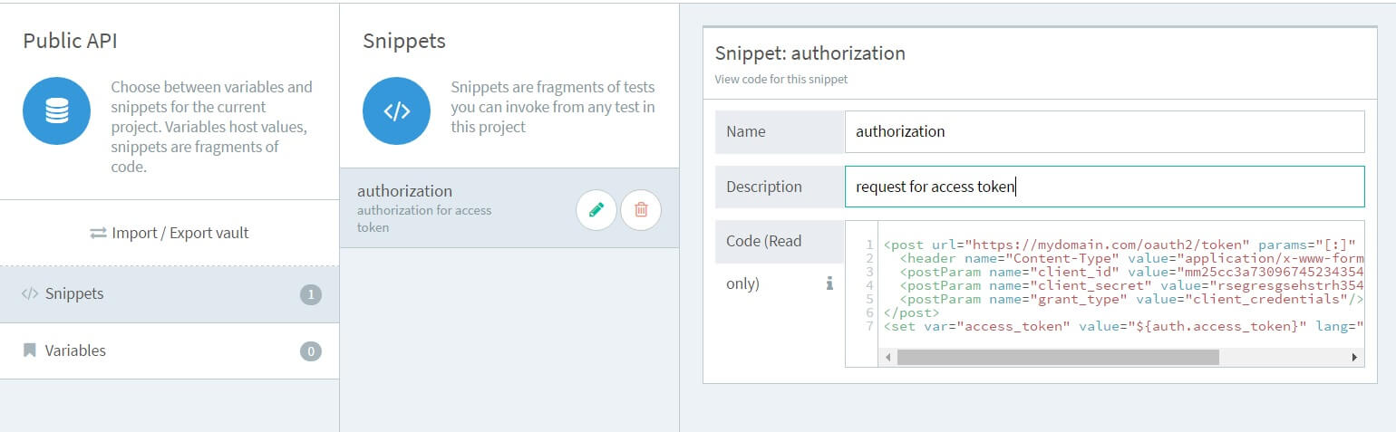 Now you can proceed with creating the test. Once done, you may create other tests for your API. Once again, click +New Test. Once you are in the Composer, you can open the Vault panel and select the snippet saved in the previous step.