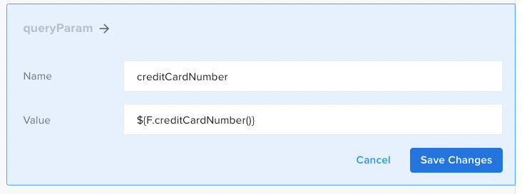 • Value: The value of the param. For example, ${F.creditCardNumber()}.