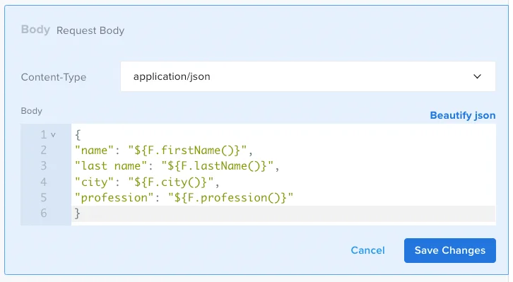 • Value: The method to use to generate data. For example, ${F.fullName()} will generate a random full name.