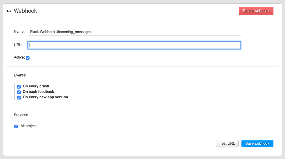 URLandEventsalready filled in and selected.- Click Test URL to test the webhook.