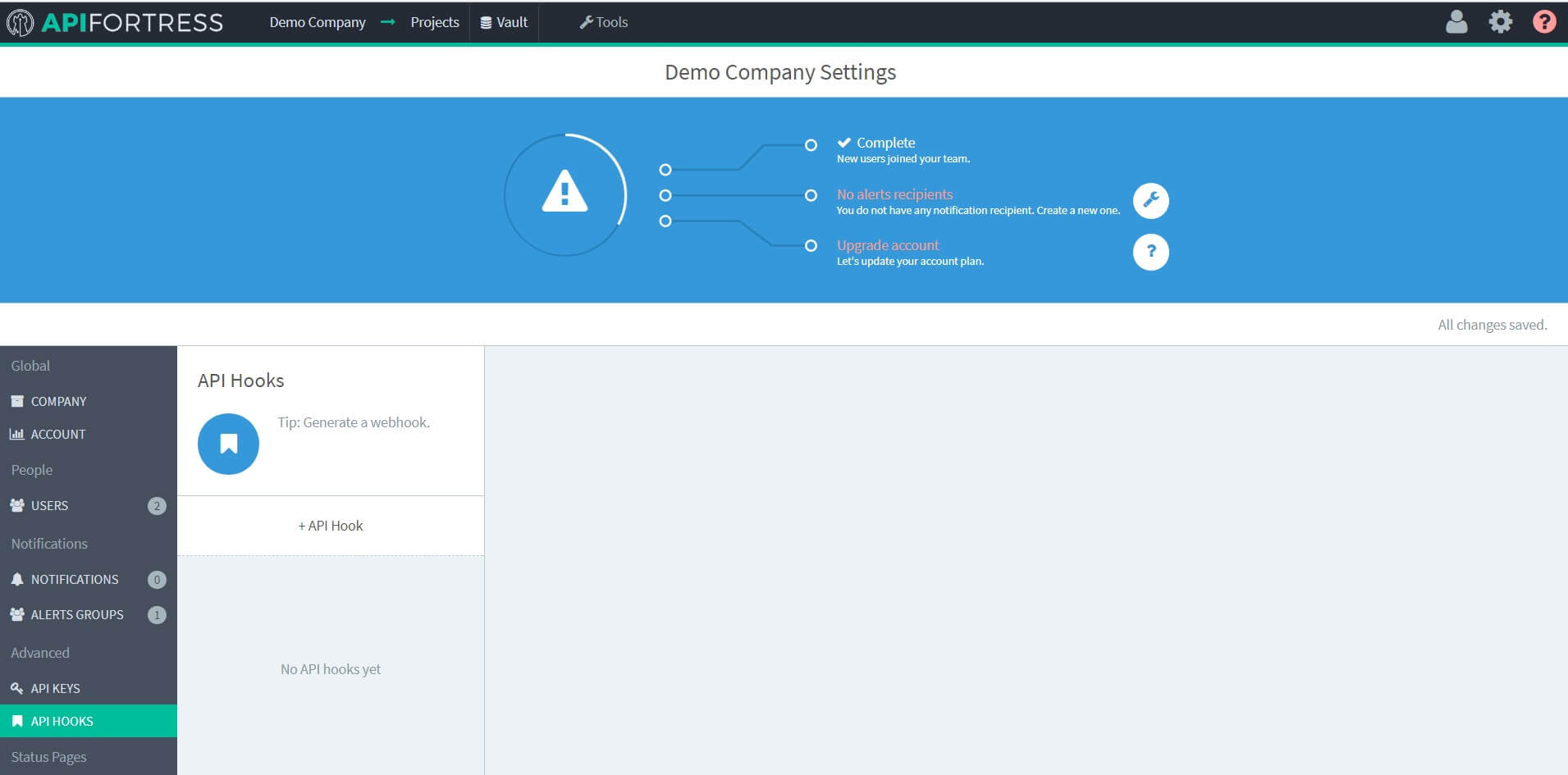 First, you need to create the API Hook by going to the Company Settings page and clicking API Hooks section. To do this you need to be a Manager of the Company.