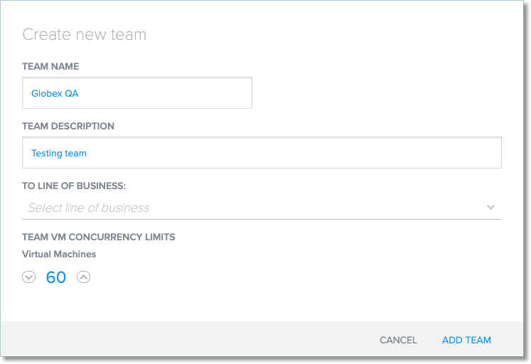 - Under TEAM CONCURRENCY LIMITS, set the number of concurrent virtual machines that the team can access. For more information about concurrency, see Managing Concurrency.