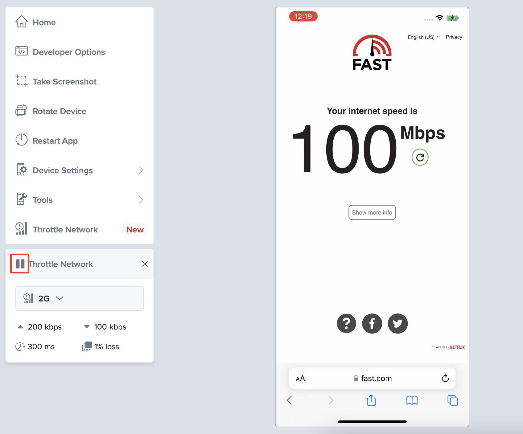 - In the live test window, in the left toolbar, click Throttle Network to open the network throttling tool.