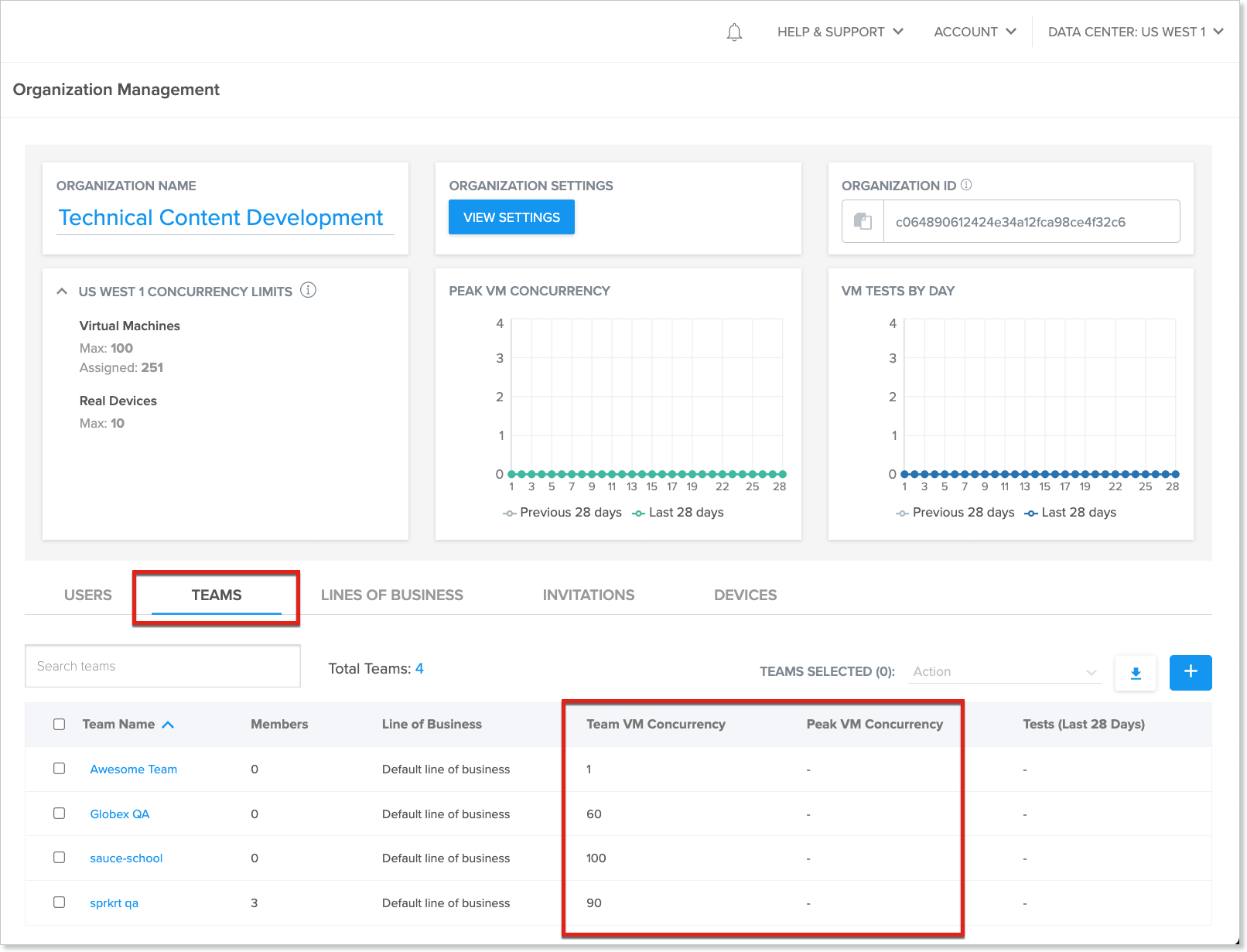 - On the Organization Management page, click the TEAMS tab. Team VM Concurrency, Team Real Device Concurrency and Peak VM Concurrency will be displayed for each team in the organization.
