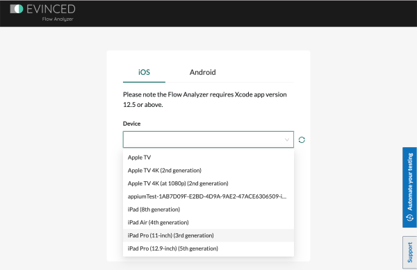 Let's look at easy it is to connect to an iOS device from the Evinced Mobile Flow Analyzer desktop client.