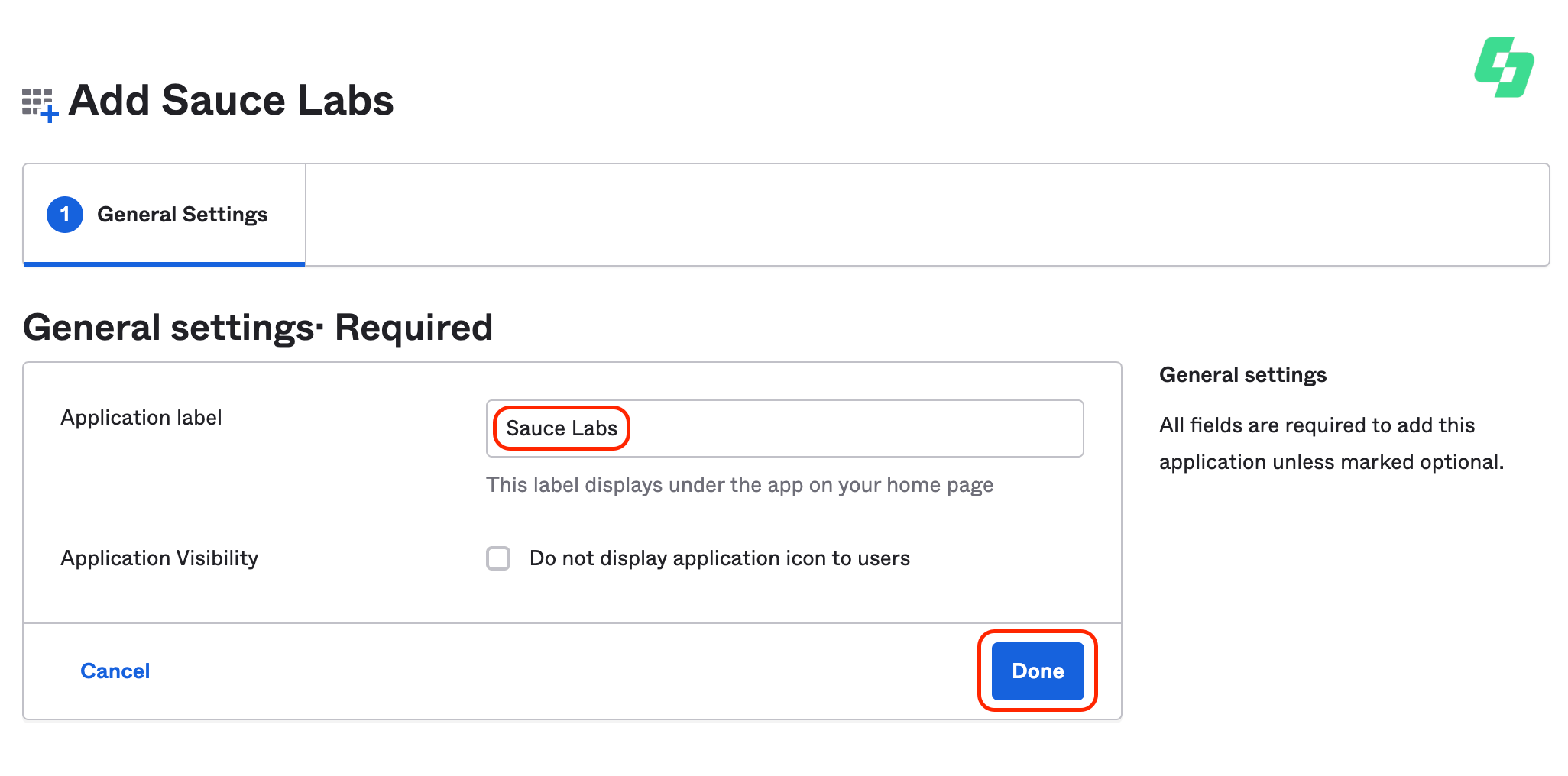 cautionEnsure that you install the new Sauce Labs app featuring the green logo. The app with the previous red logo is considered a legacy version and should not be used for new SSO integrations. It is integrated with the deprecated SSO implementation.