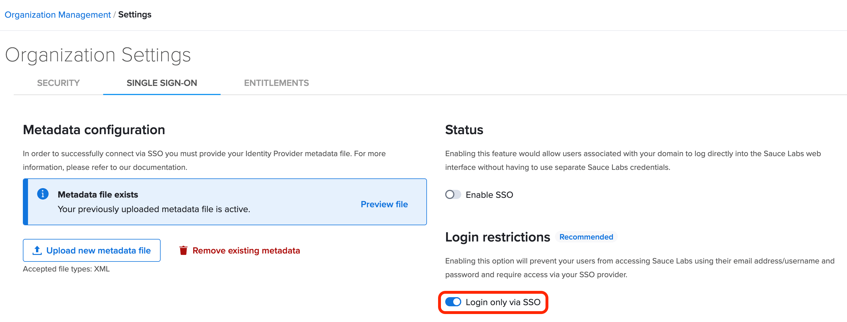 - Export or copy the updated metadata file from your identity provider, then upload it to Sauce Labs. For information on how to upload the metadata file, see Integrating With Sauce Labs Service Provider.