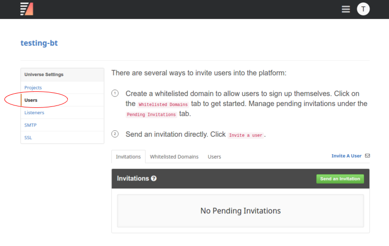 Users: On the user management screen, you can send email invitations to new users to join. You can also allowlist one or more domains from which users can sign up. Additionally, you can manage passwords and access control for individual users. For full details on user management, refer to User Management.