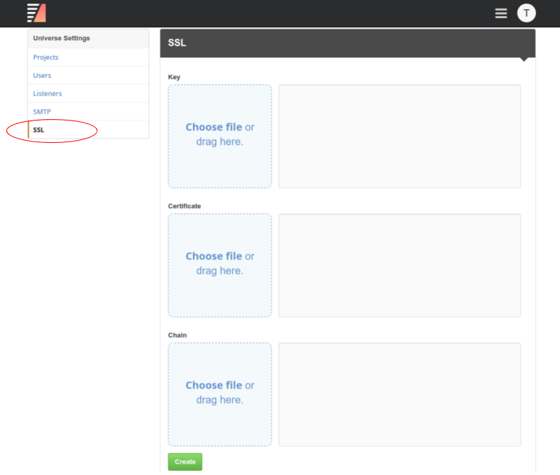 SSL: To change your SSL certificates, enter your key, certificate, and chain files in the provided fields.