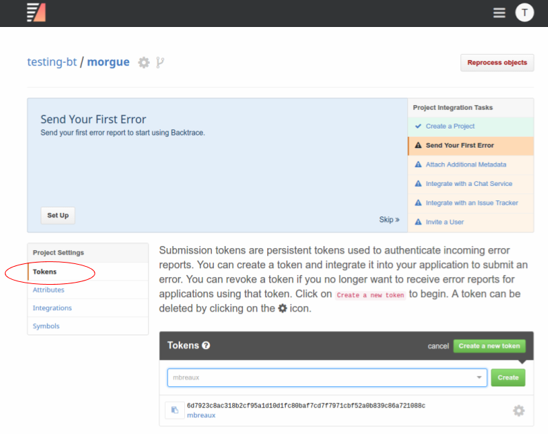 Tokens: Submission tokens allow the upload of crash data and other symbols into a project. To create a token, click Create a New Token and then Create.