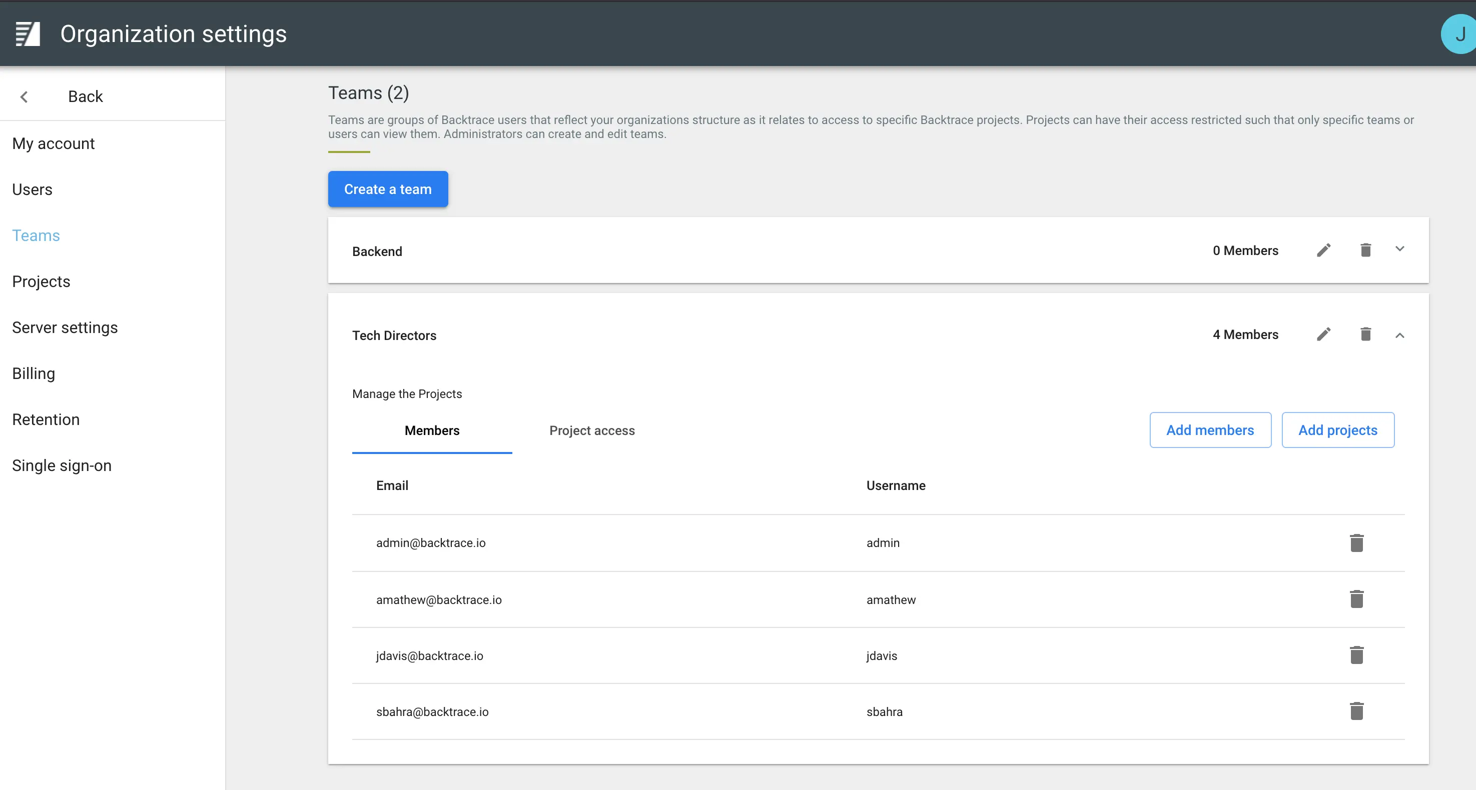 Teams are a way to group users together for the purposes of allowing access to certain projects. Organization Administrators can access Organization Settings - Teams to create and manage new teams.