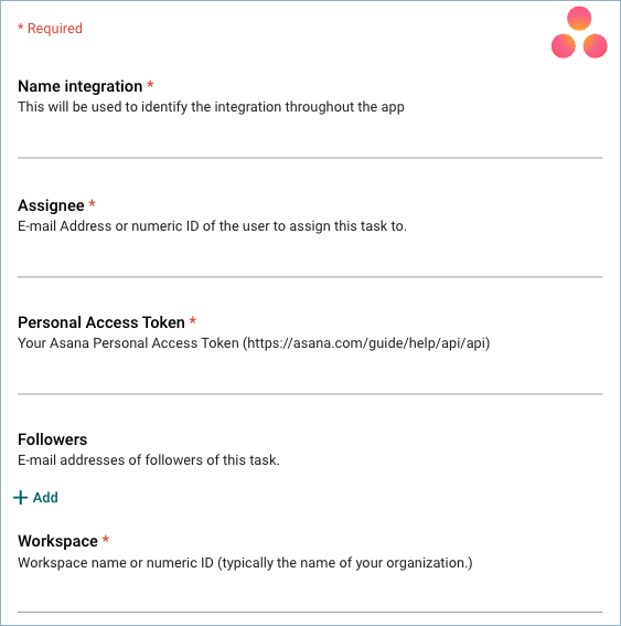 Select Asana and fill in the required settings (name, assignee, personal access token, and workspace).