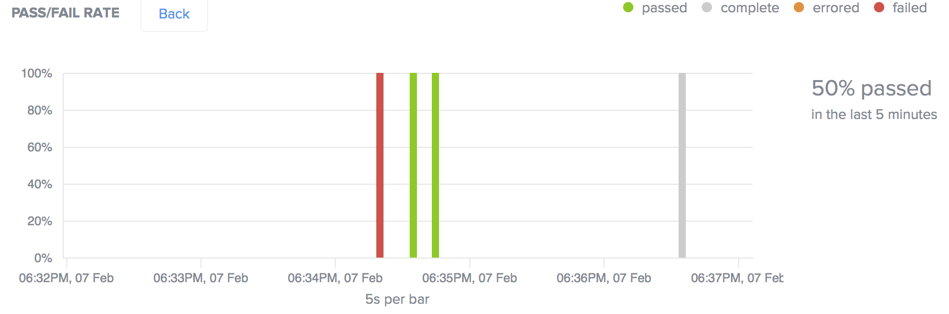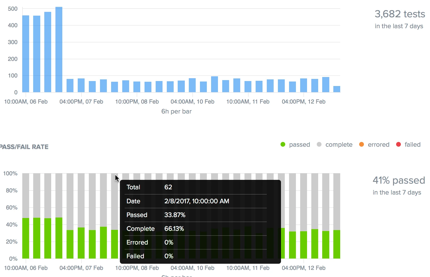 | Pass/Fail Rate | For each increment in the time period, the percentage of tests that: