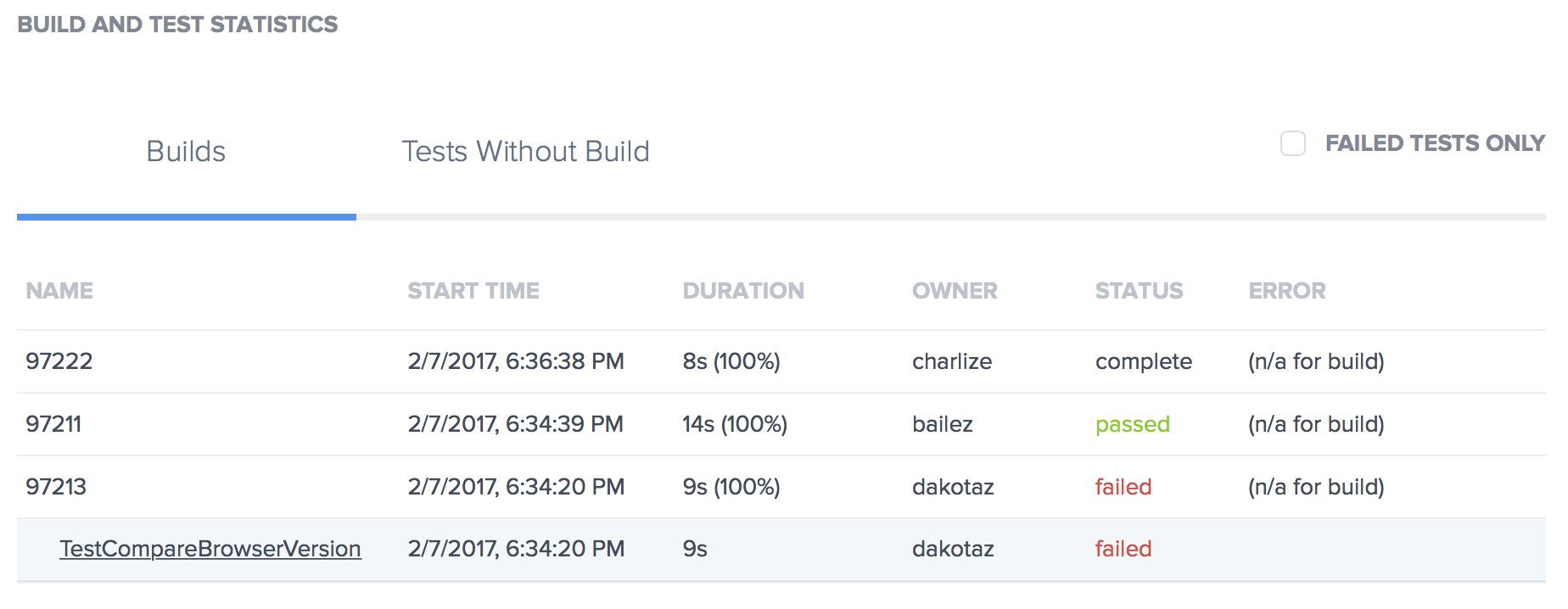 | Build and Job Statistics | A snapshot of all tests run during the time period, displayed in separate tabs based on whether the test is or is not assigned a Build ID. For each test listed, basic data about the time the test was executed, the time it took to run, the Sauce Labs user who ran it, and its outcome. Tests in the Builds tab have an additional statistic — Efficiency — that indicates whether the tests in the build run in parallel to optimize the execution time for the entire build. Tests in the Jobs without build tab have an additional statistic — Error — which displays the error message for the test where it was interrupted. This visualization can be further filtered to show only tests with a failed and/or errored status. |