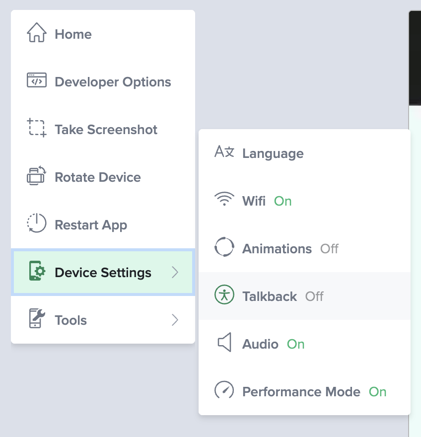 - Android TalkBack is ONLY supported on Private devices, reach out to our Support Team or your Sauce Labs representative to get this configured.