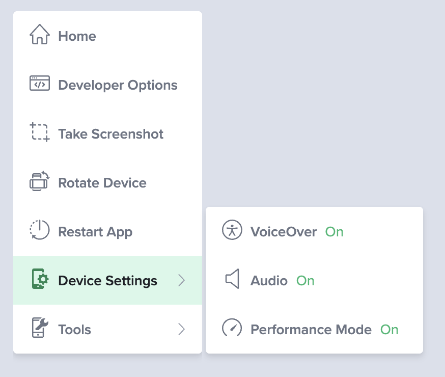 With the Audio Streaming feature, you are able to hear the sound your application is making during a Live Testing session. It allows you to validate audio streams, notification sounds, and animations.