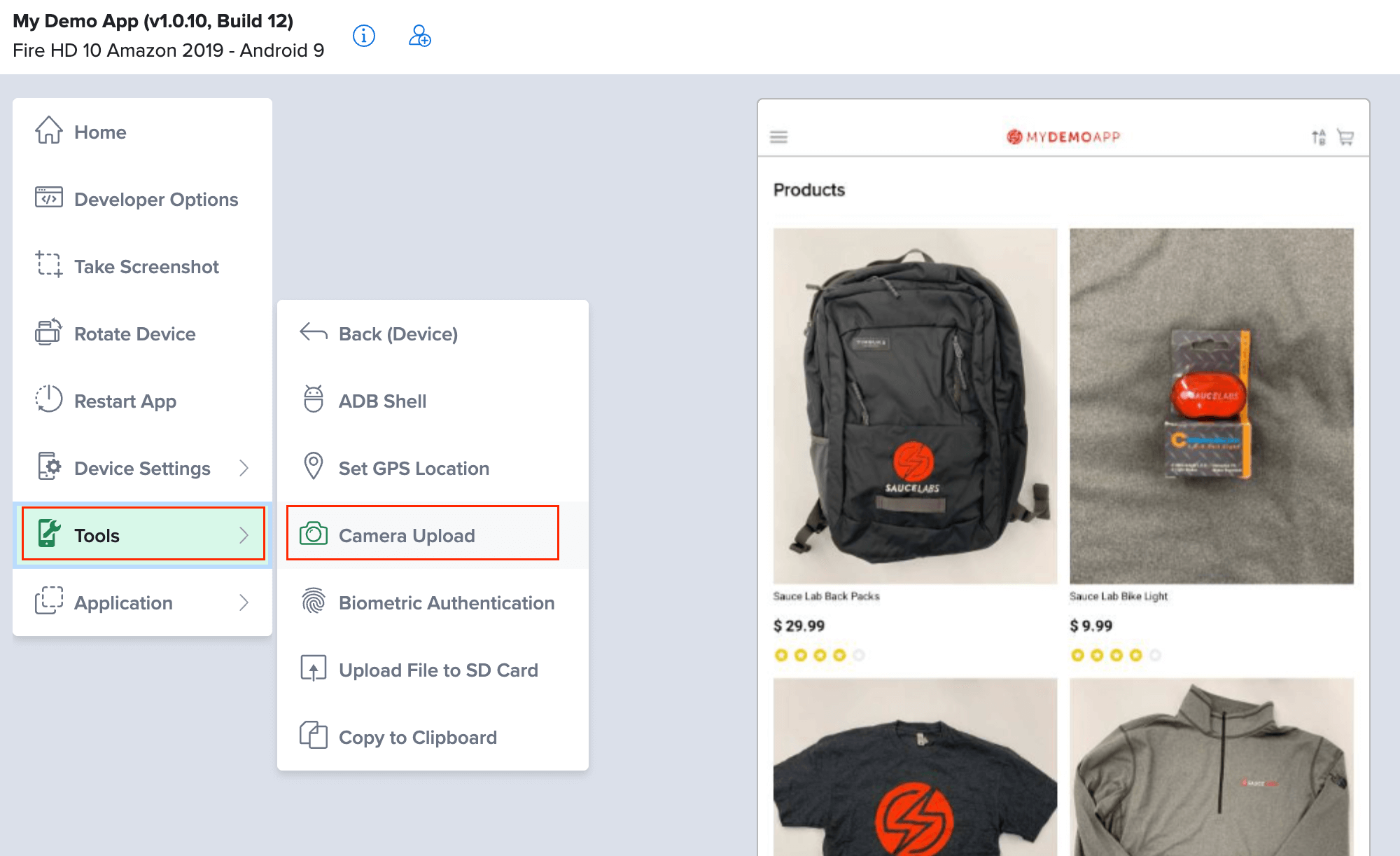 During a live test, you'll be prompted in Sauce Labs to upload a photo that will be fed to your app, rather than using your device camera to take the photo.