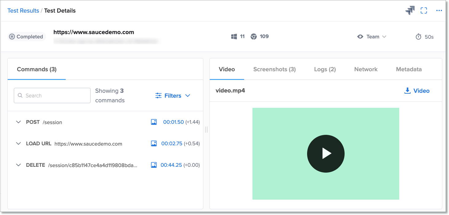 - Click the Metadata tab to see the metadata attached to your test. Some test metadata, such as the test status, can be updated via the Sauce REST API.