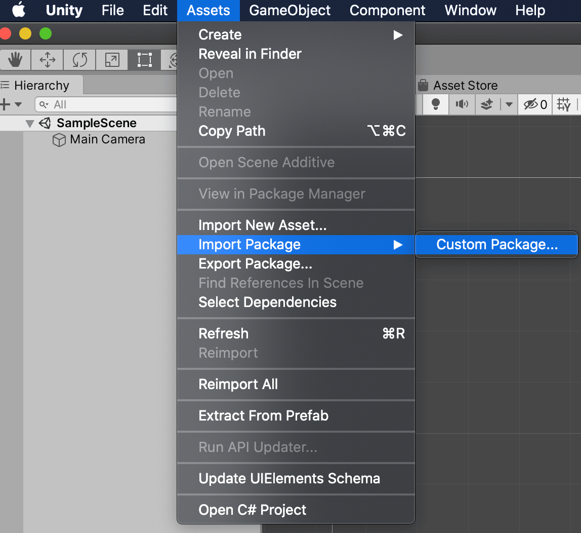 2. In your open Unity project, navigate to Assets > Import Package > Custom Package.