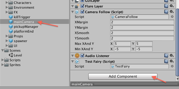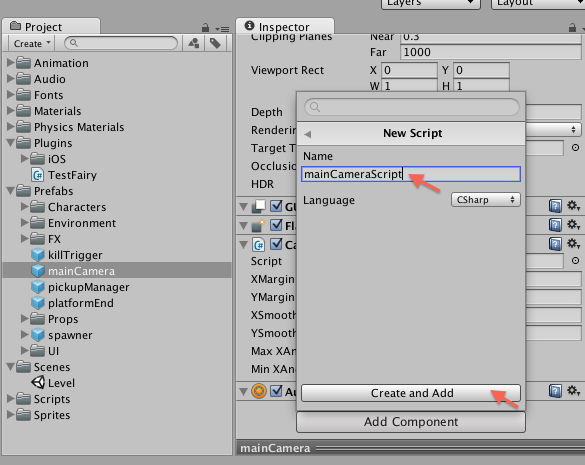 5. Click Add Component again, and select a Script component. Type in the script's name, for example, mainCameraScript, and click on Create and Add.