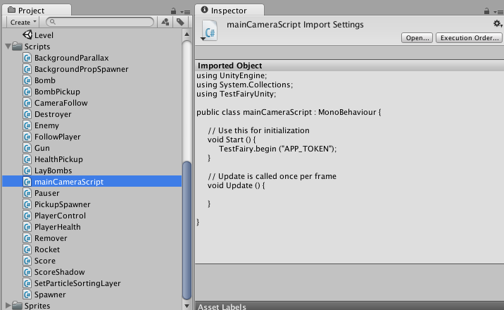 6. Edit the newly created CSharp script, add using TestFairyUnity; to the import section, and a call to TestFairy.begin(); with your app token. You can find your app token on the Account Settings page.