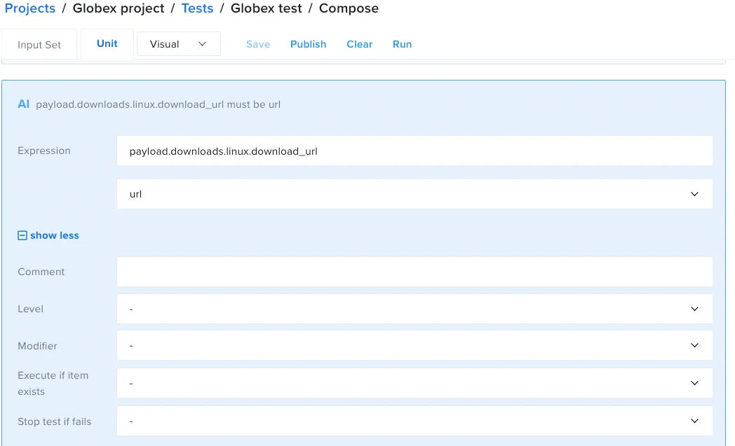 3. In the Assert is window, in the Expression field, enter payload.downloads.linux.download_url. This expression checks for the download_url field in the json response payload.