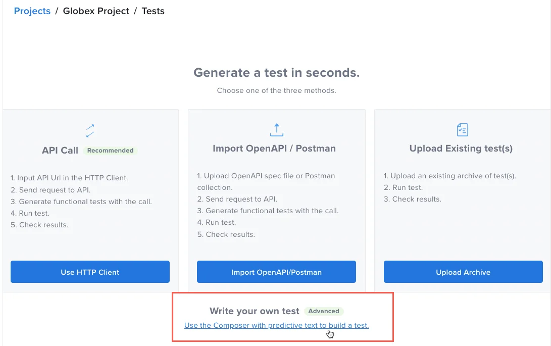 Guides you through creating API tests using automated real-time suggestions via predictive text. No coding experience is required.