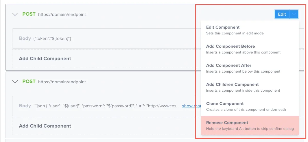 Click Edit to modify an existing component, or use the dropdown menu next to Edit to perform the actions shown below.
