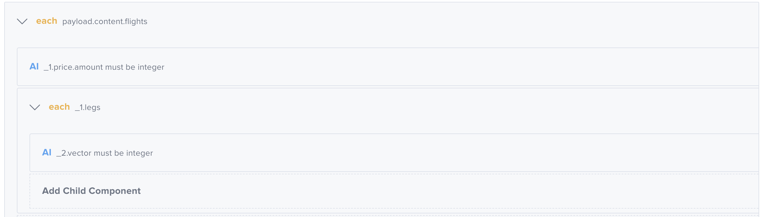 For Each flights collection nested in content item, checks if price.amount is an integer. Then, for Each legs array, a nested collection in the flights collection, checks if vector item is an integer value.Nested Collection Example