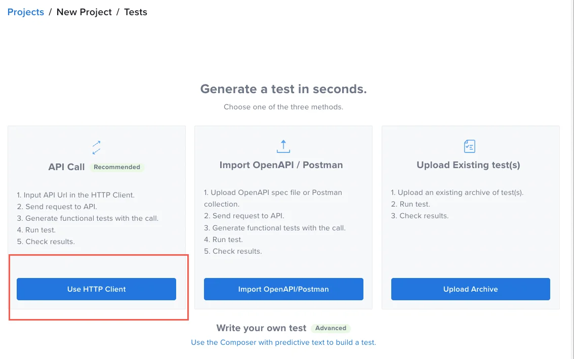 From the list of test creation methods, click Use HTTP Client.