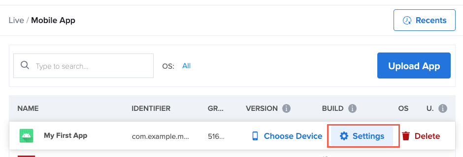 - To upload your Android or iOS app, click Upload App.