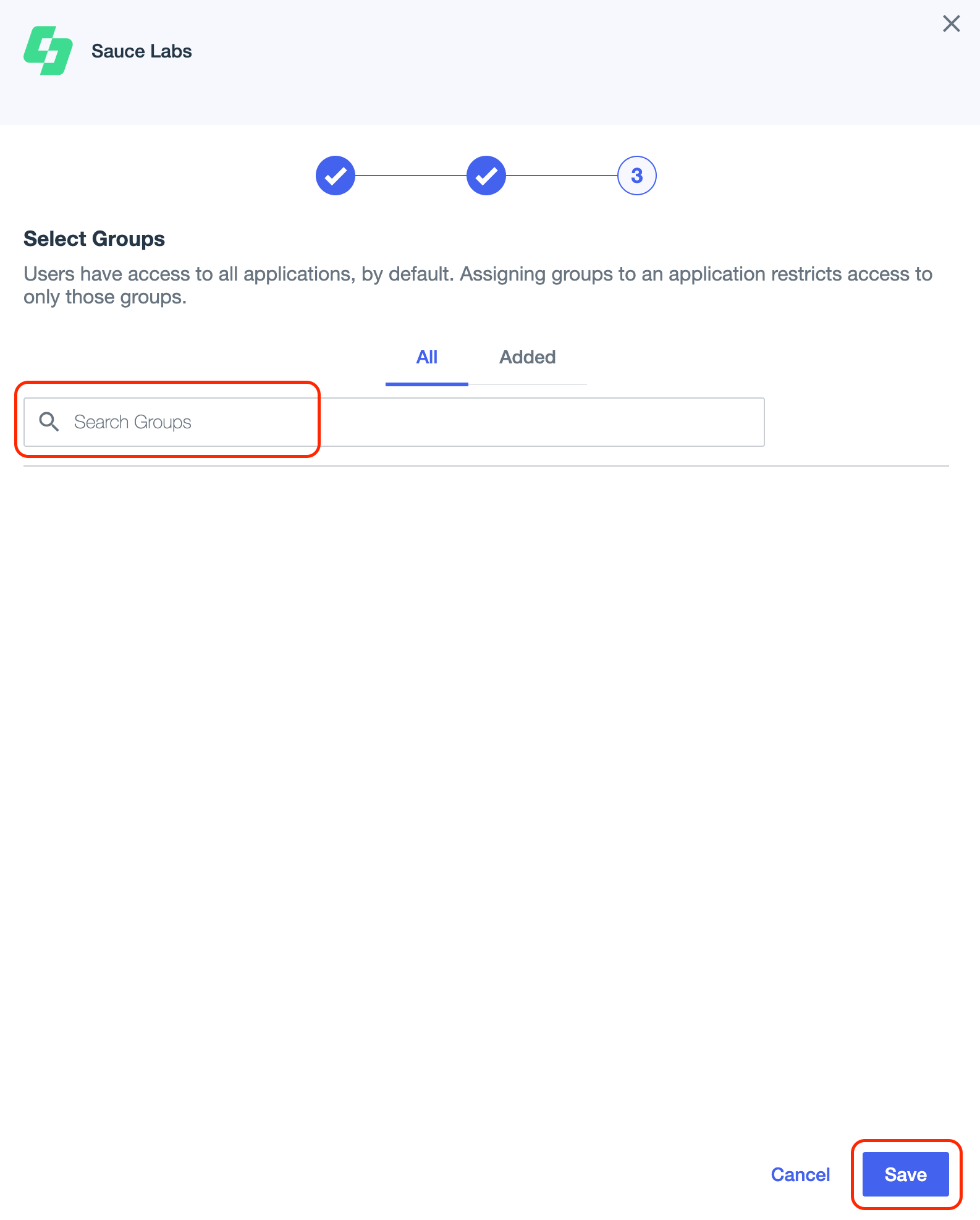 6. Optionally, choose which groups should have access to Sauce Labs via this SAML application and click Save.